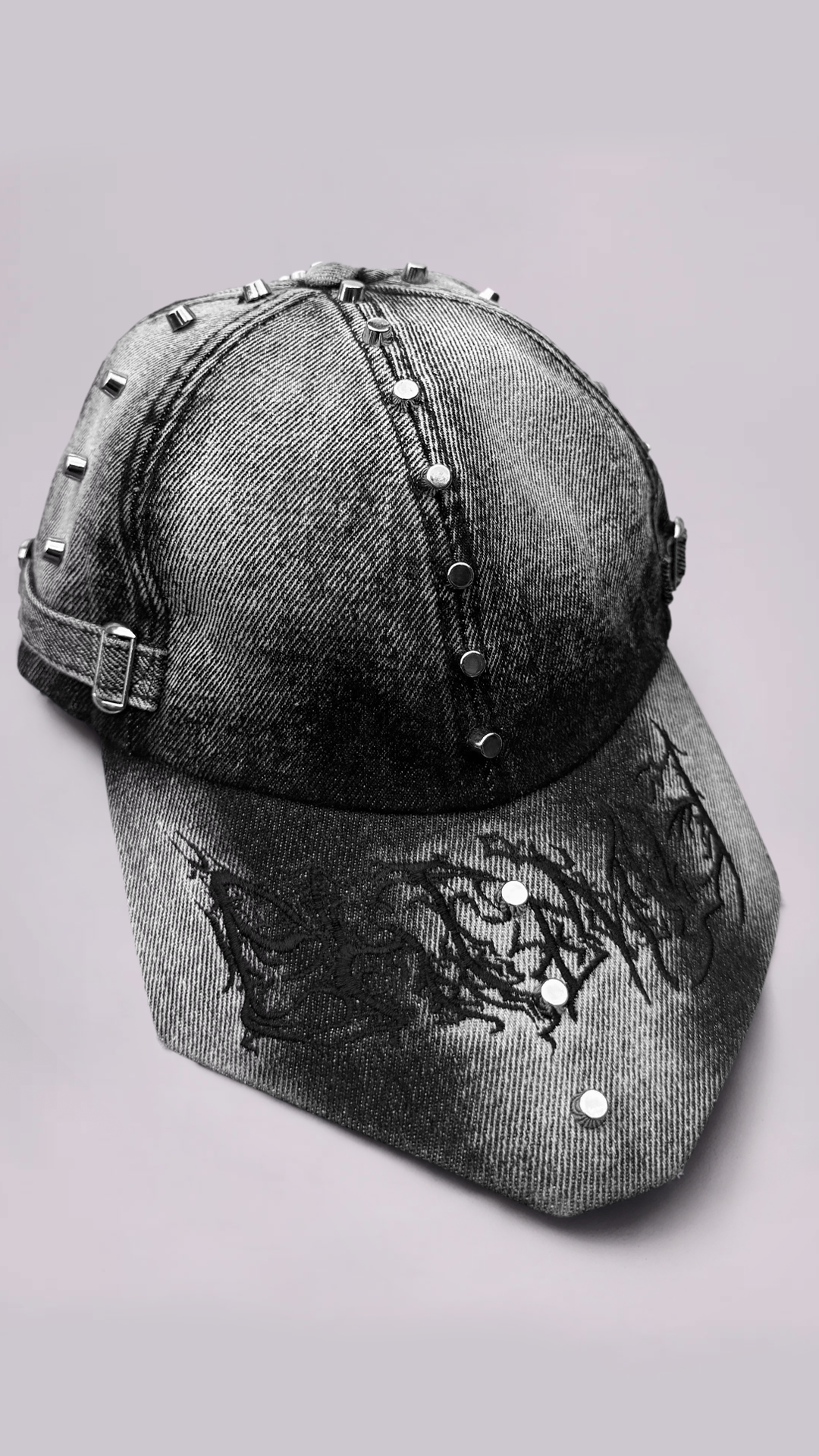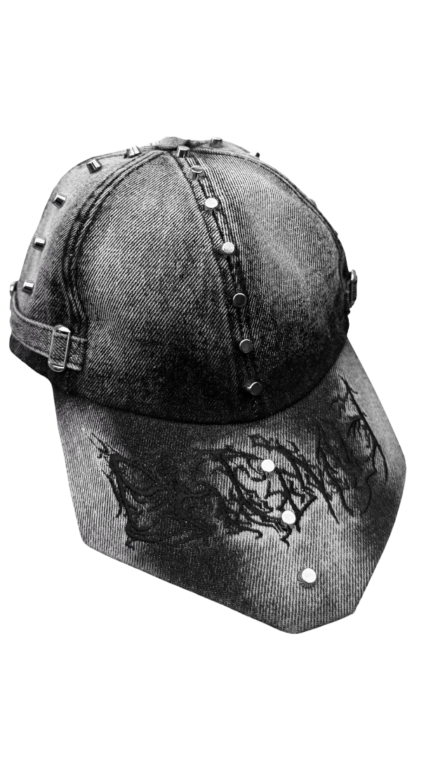 Distressed black wash denim forms the foundation, finished with a gradient fade and embroidered with a PHTMNE insignia. Silver studs trace a path like spines, changing the mundane to wearable art.